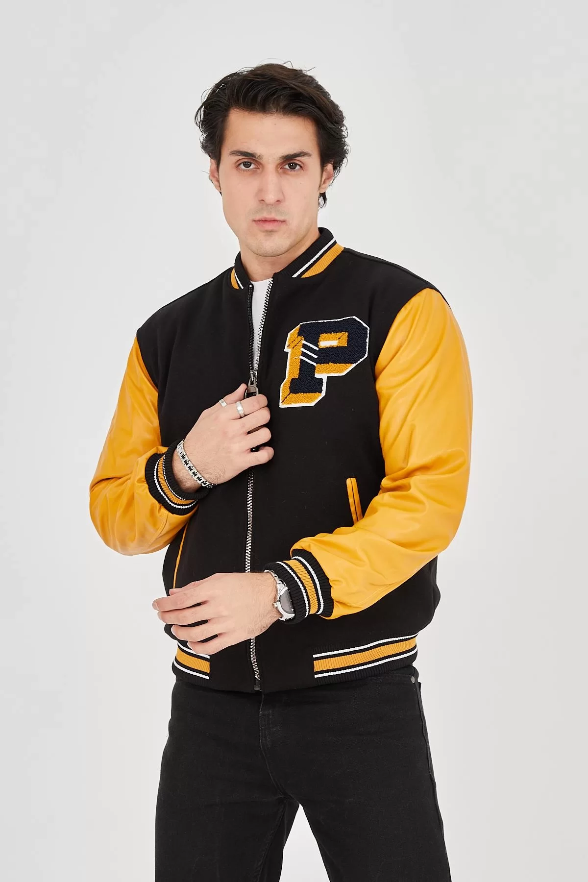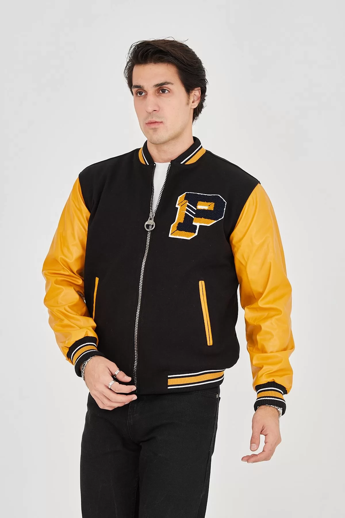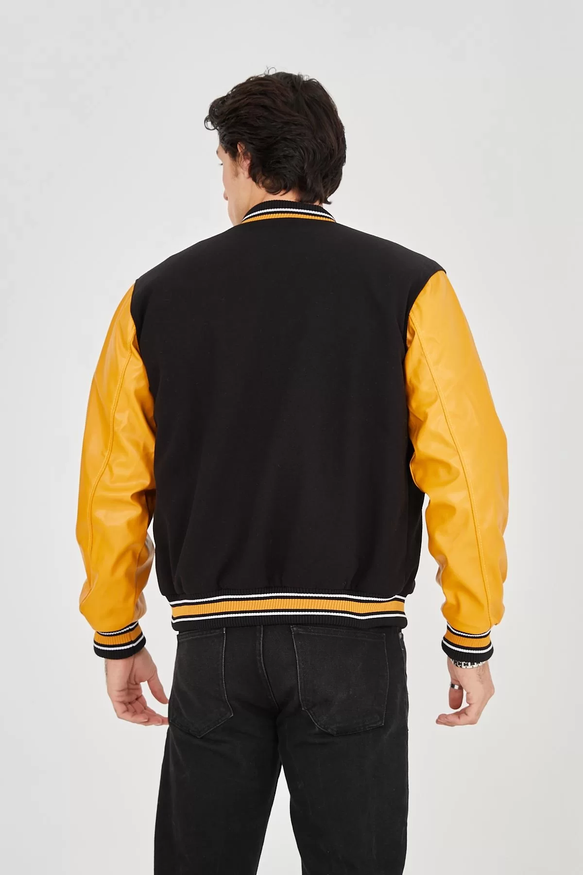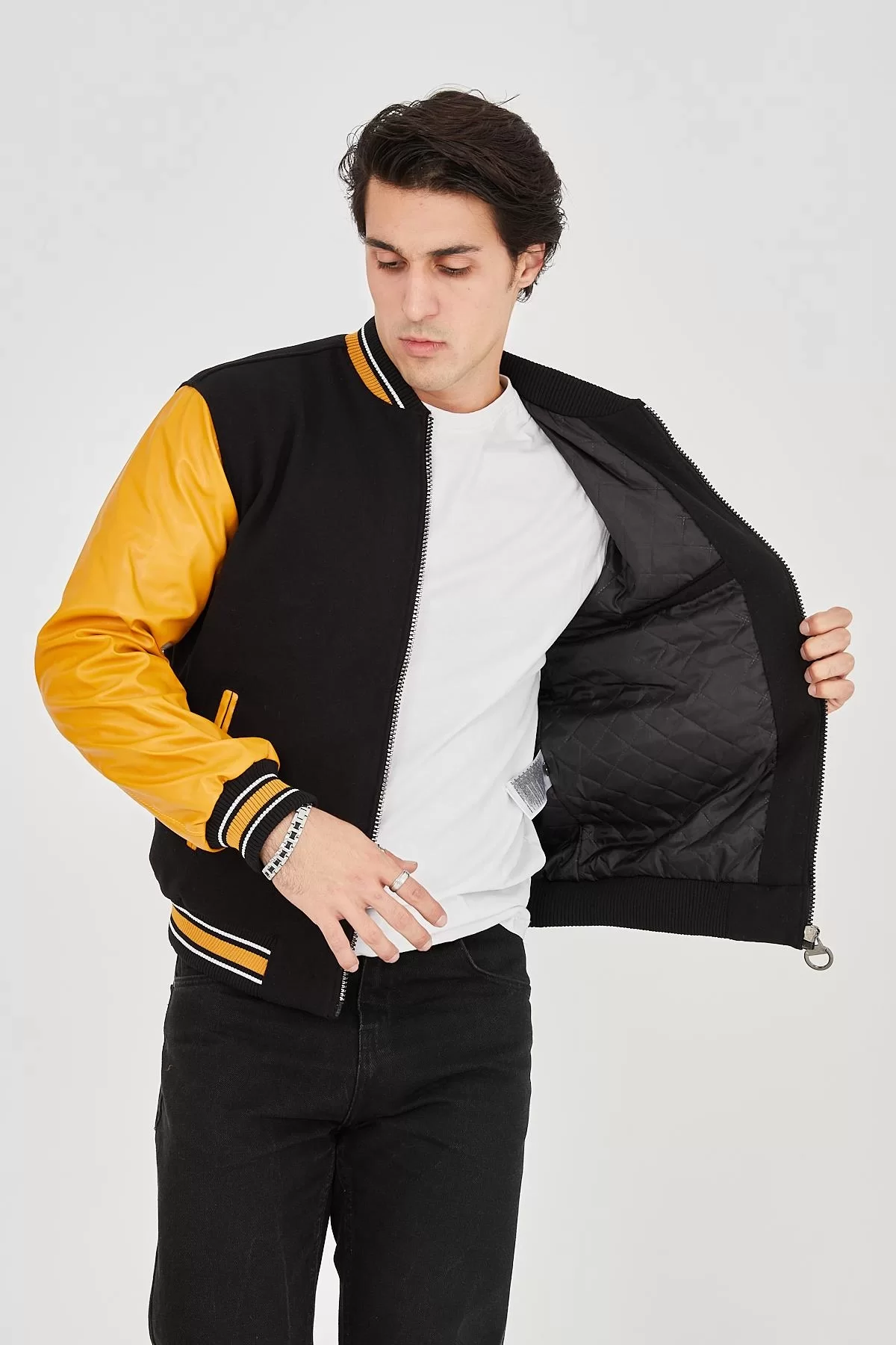 Erkek İçten Elyaf ve Astarlı Kolları Suni Deri Ceket - Sarı