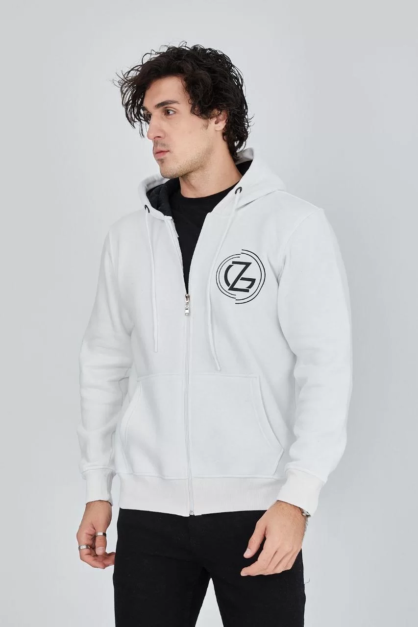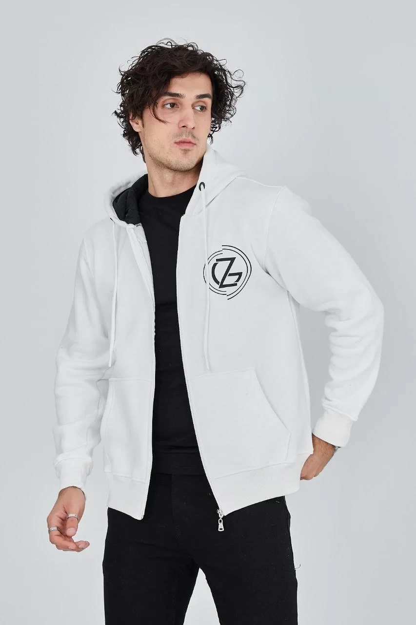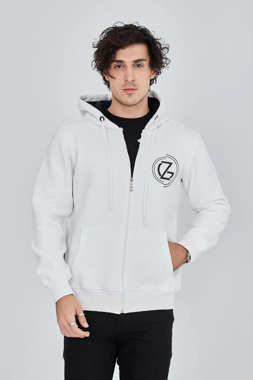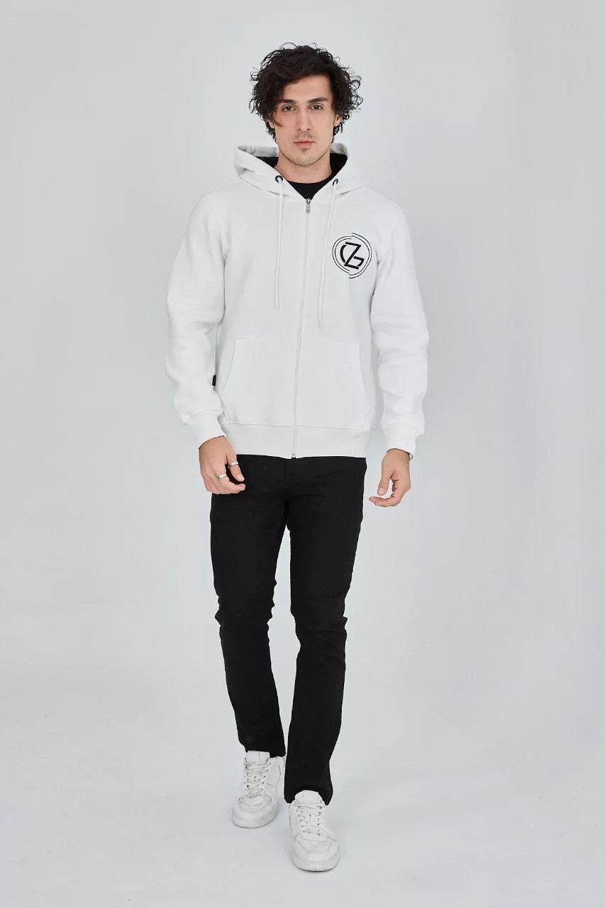 Erkek Kapüşonlu Baskılı Fermuarlı Hırka - Beyaz