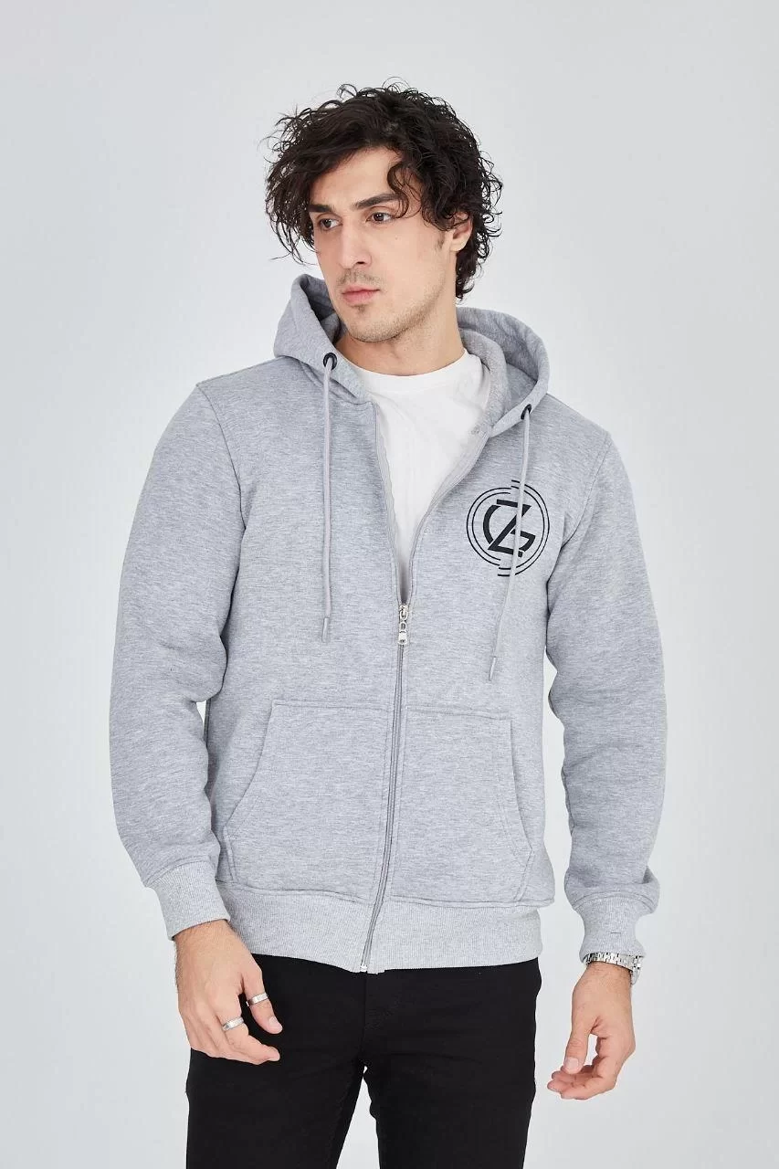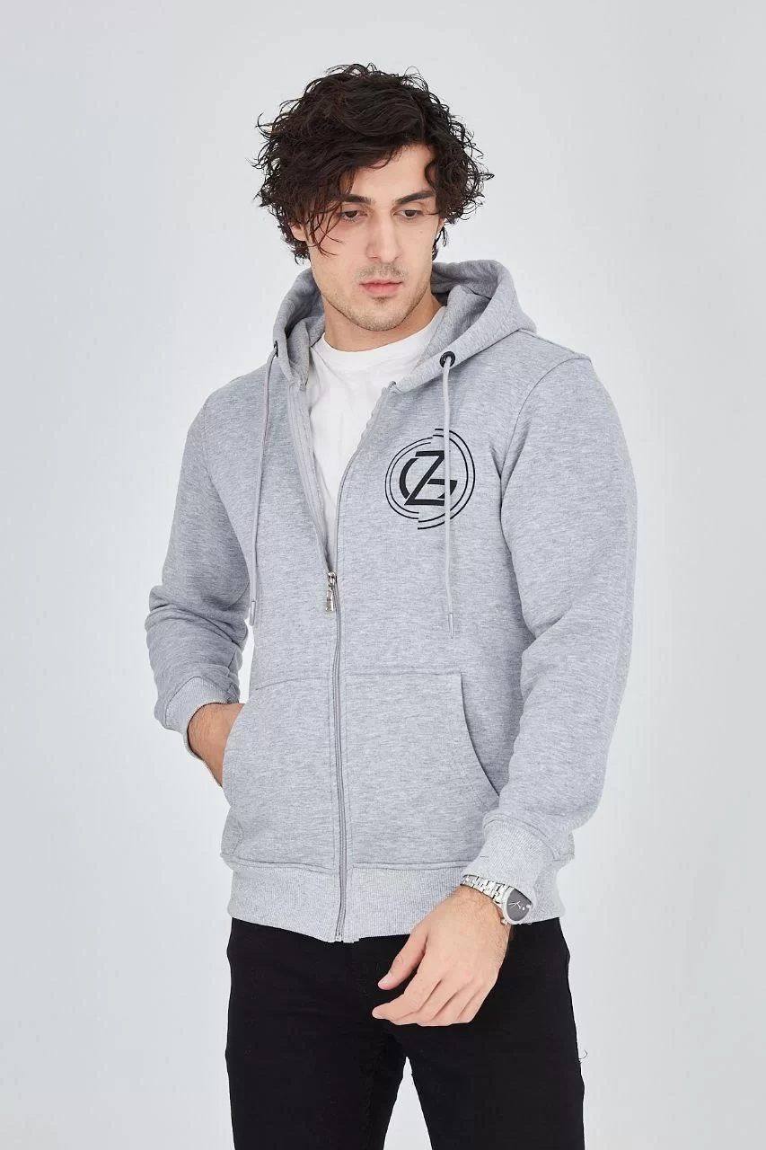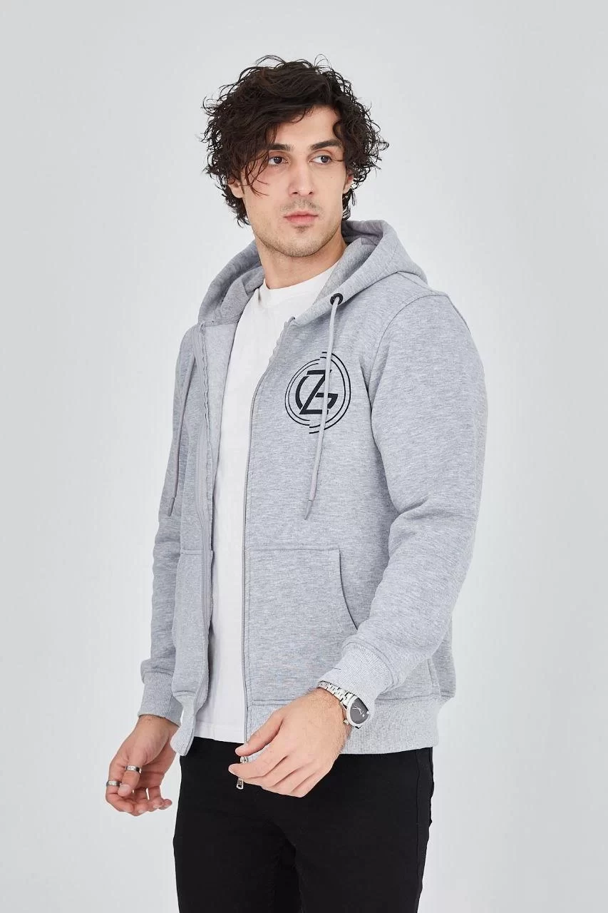 Erkek Kapüşonlu Baskılı Fermuarlı Hırka - Gri