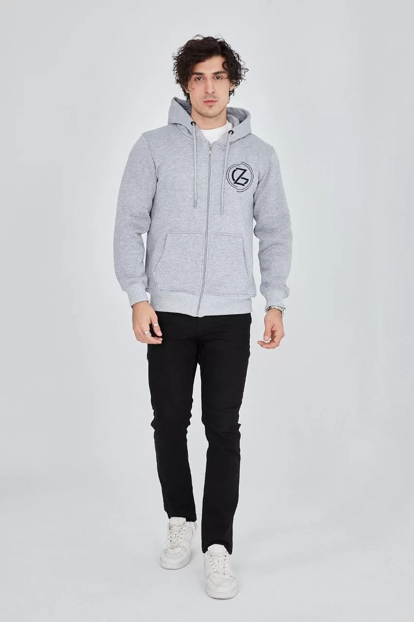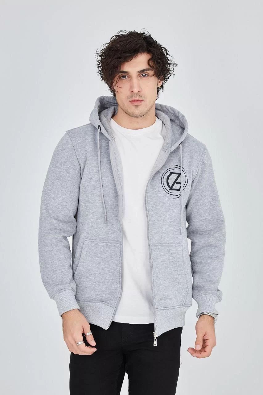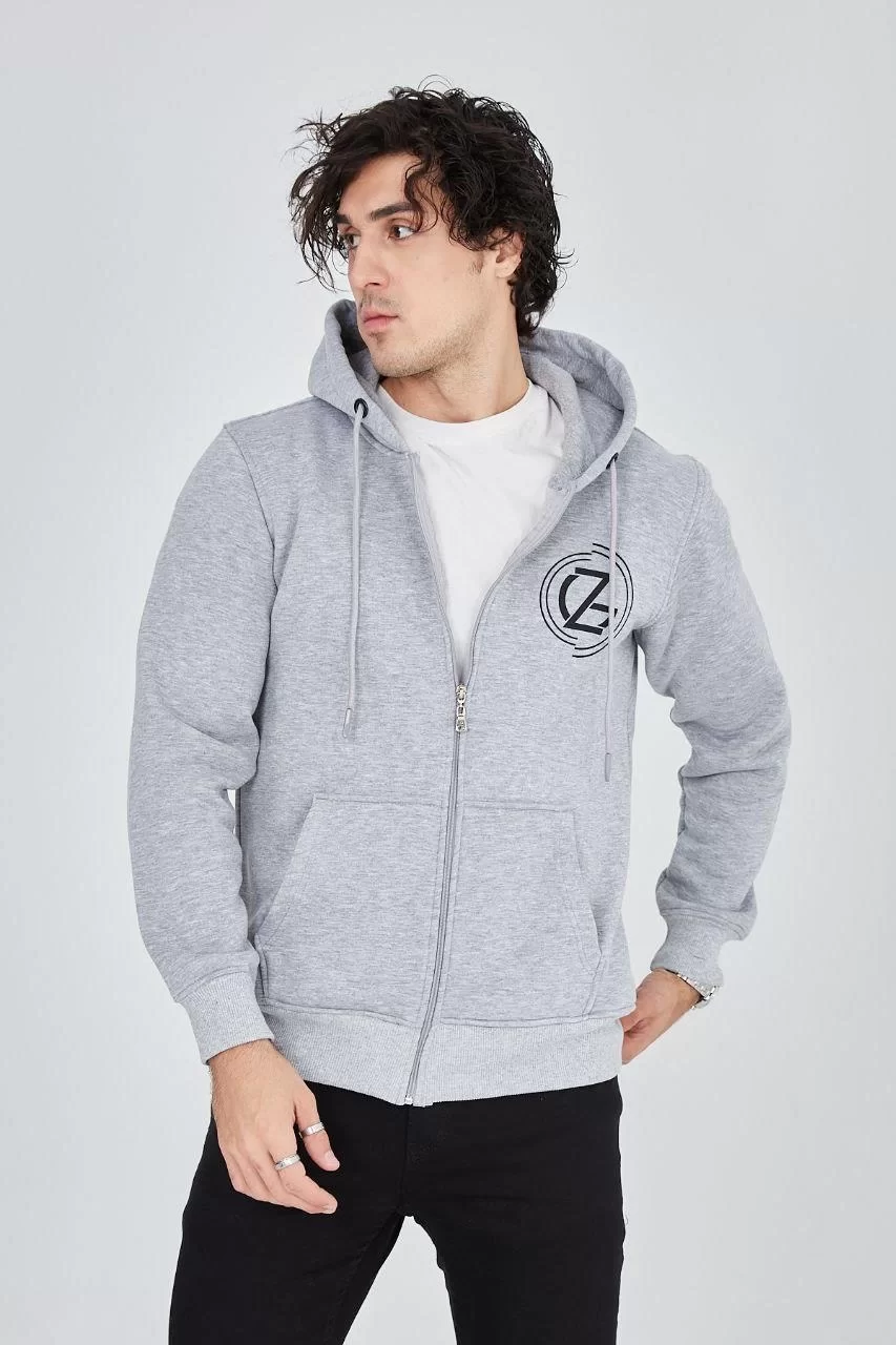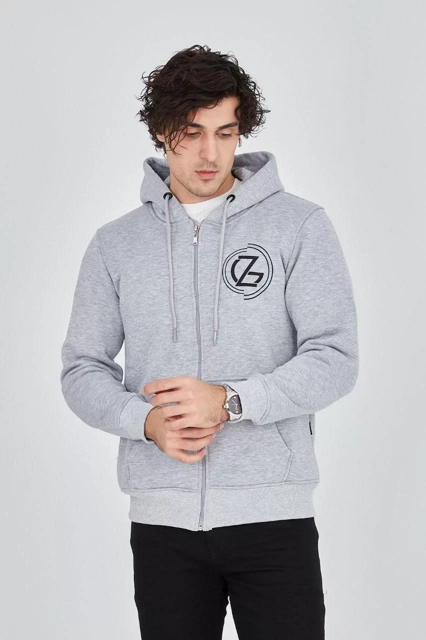 Erkek Kapüşonlu Baskılı Fermuarlı Hırka - Gri