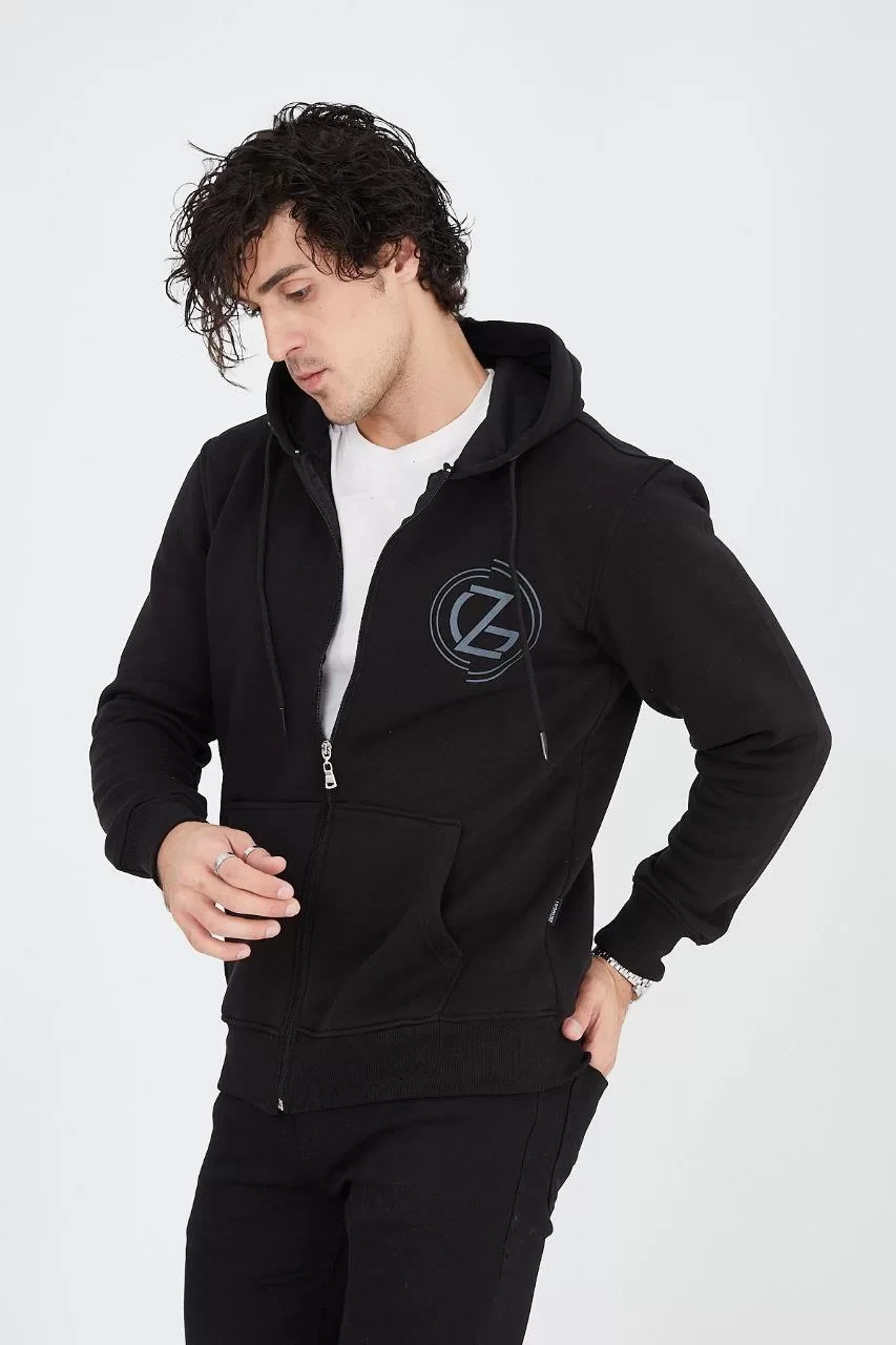Erkek Kapüşonlu Baskılı Fermuarlı Hırka - Siyah