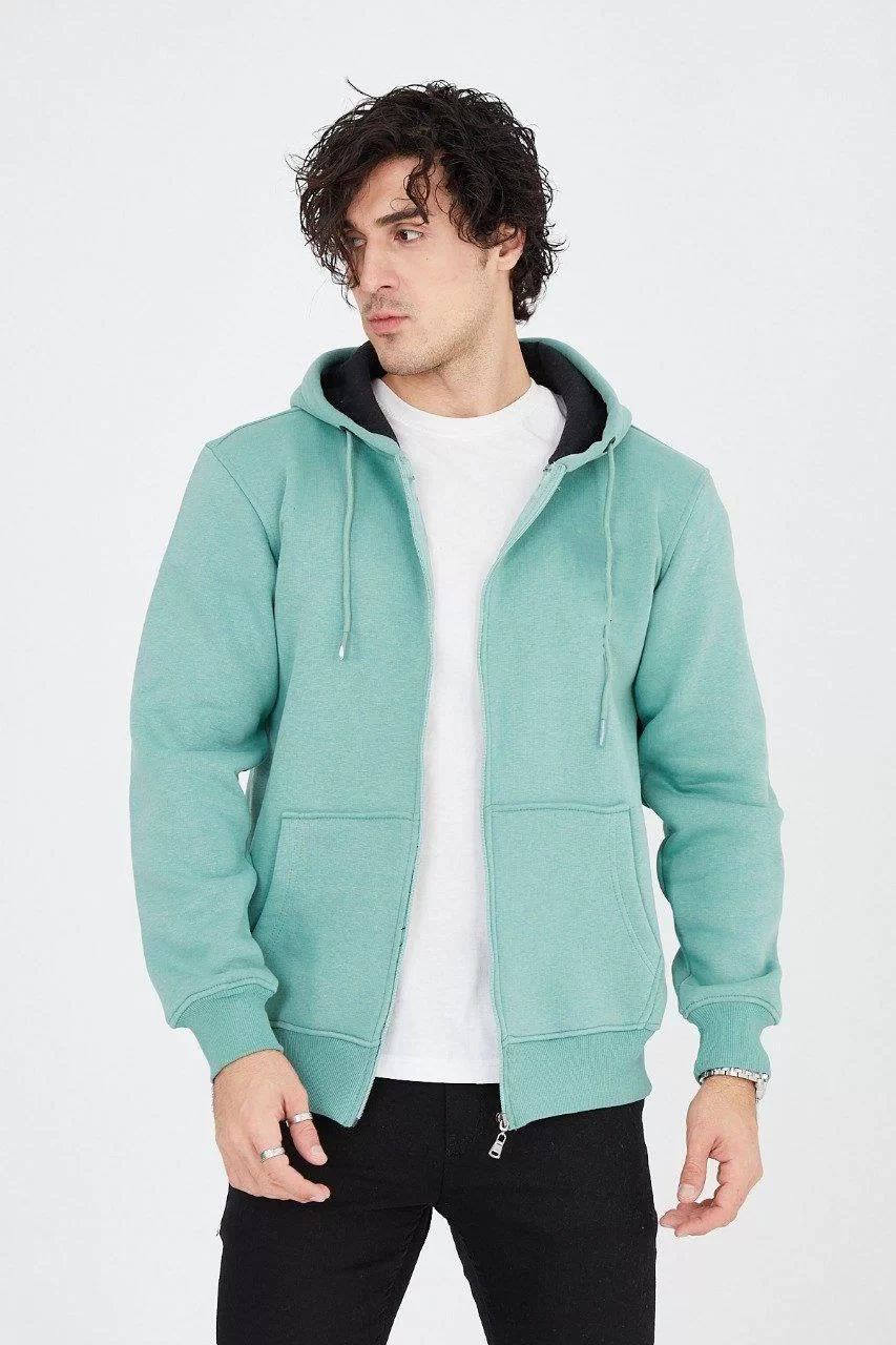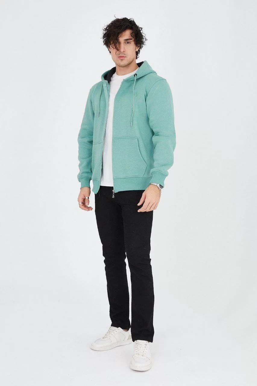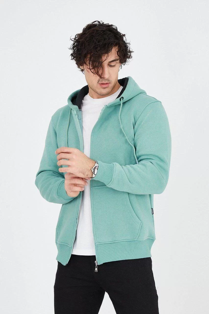 Erkek Kapüşonlu Düz Fermuarlı Hırka - Mint Yeşili