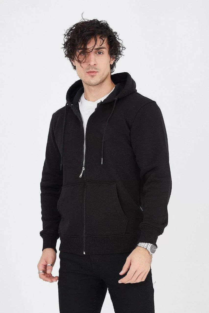 Erkek Kapüşonlu Düz Fermuarlı Hırka - Siyah