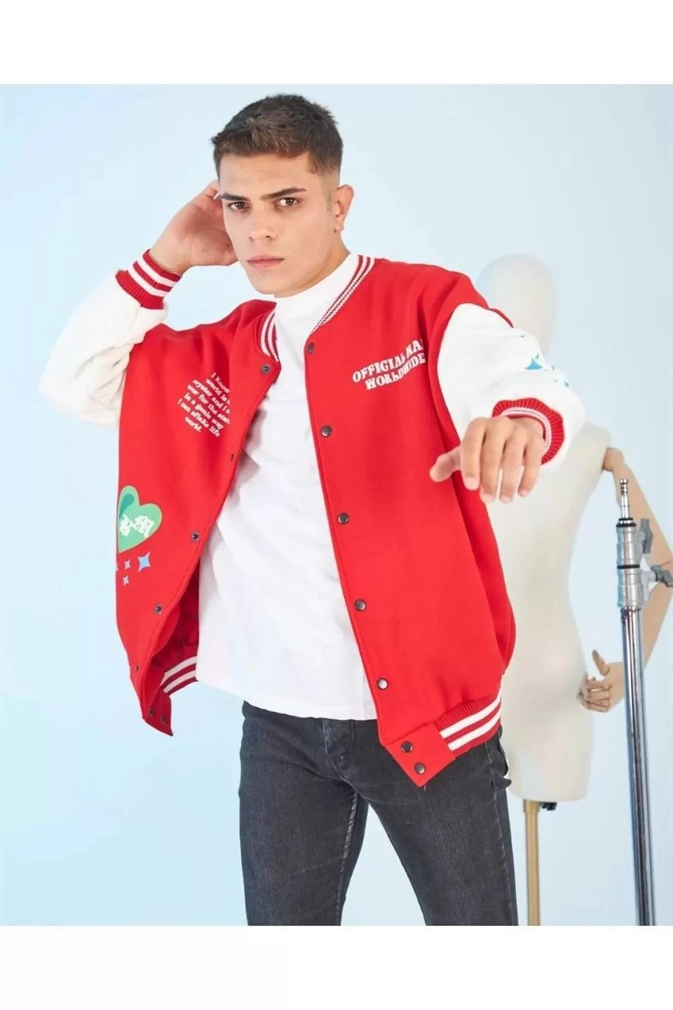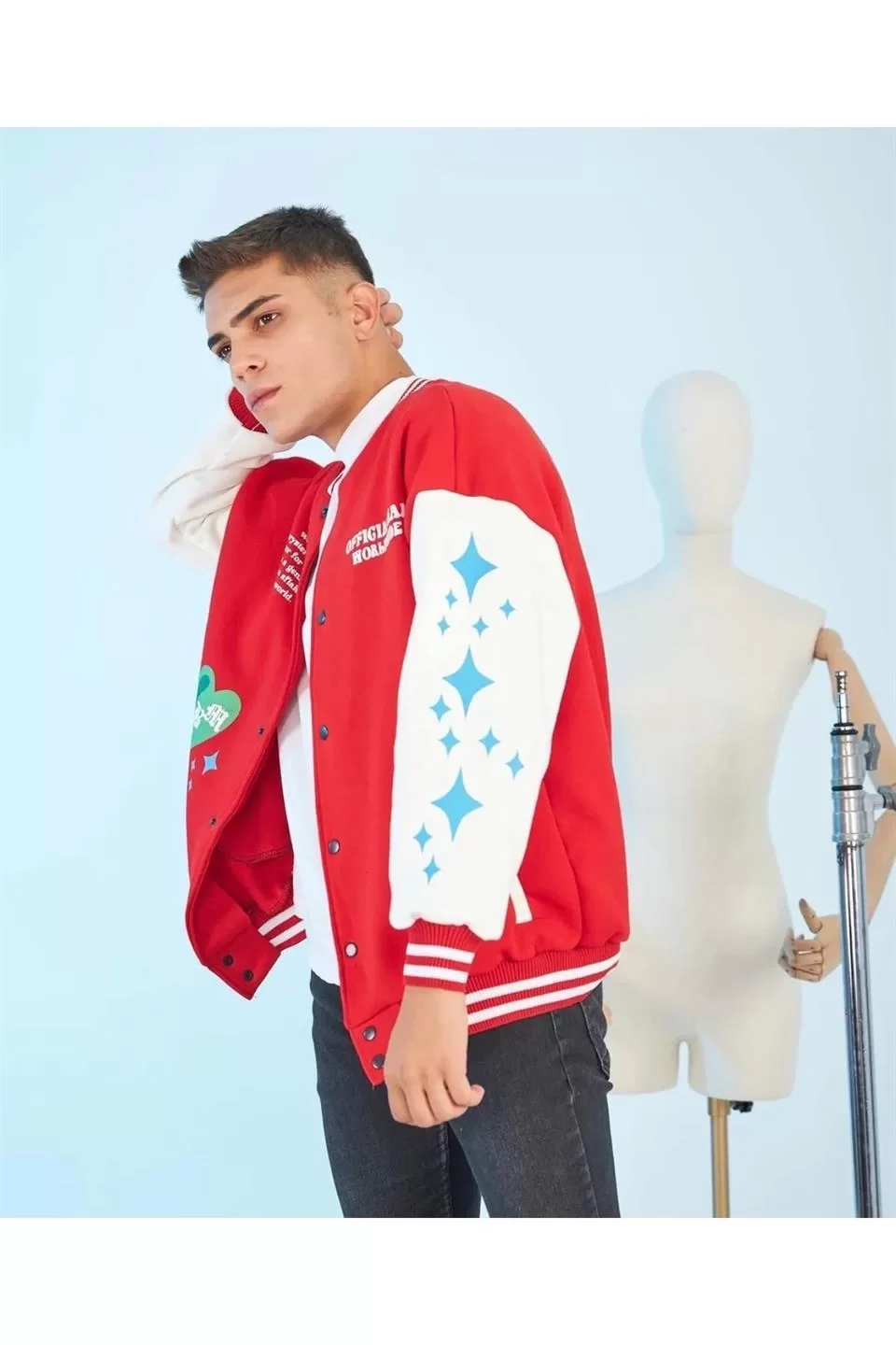 Erkek Kolları Yıldız Sırt Baskılı Oversize Kolej Ceket - Kırmızı