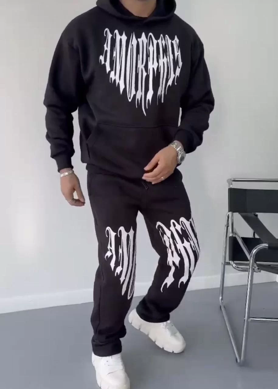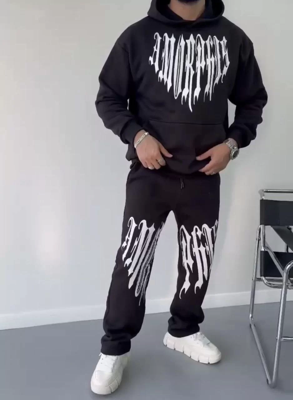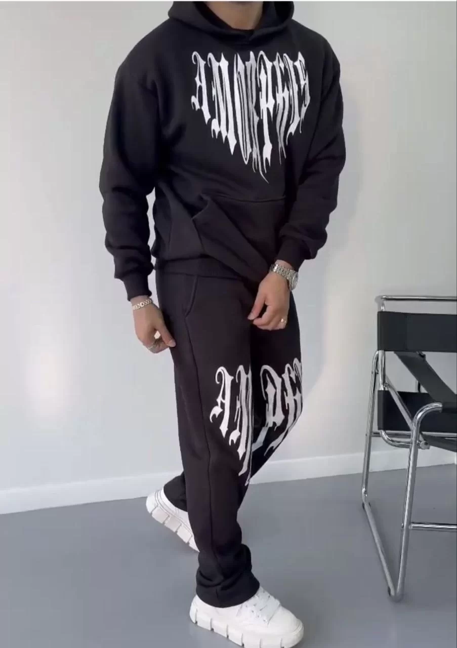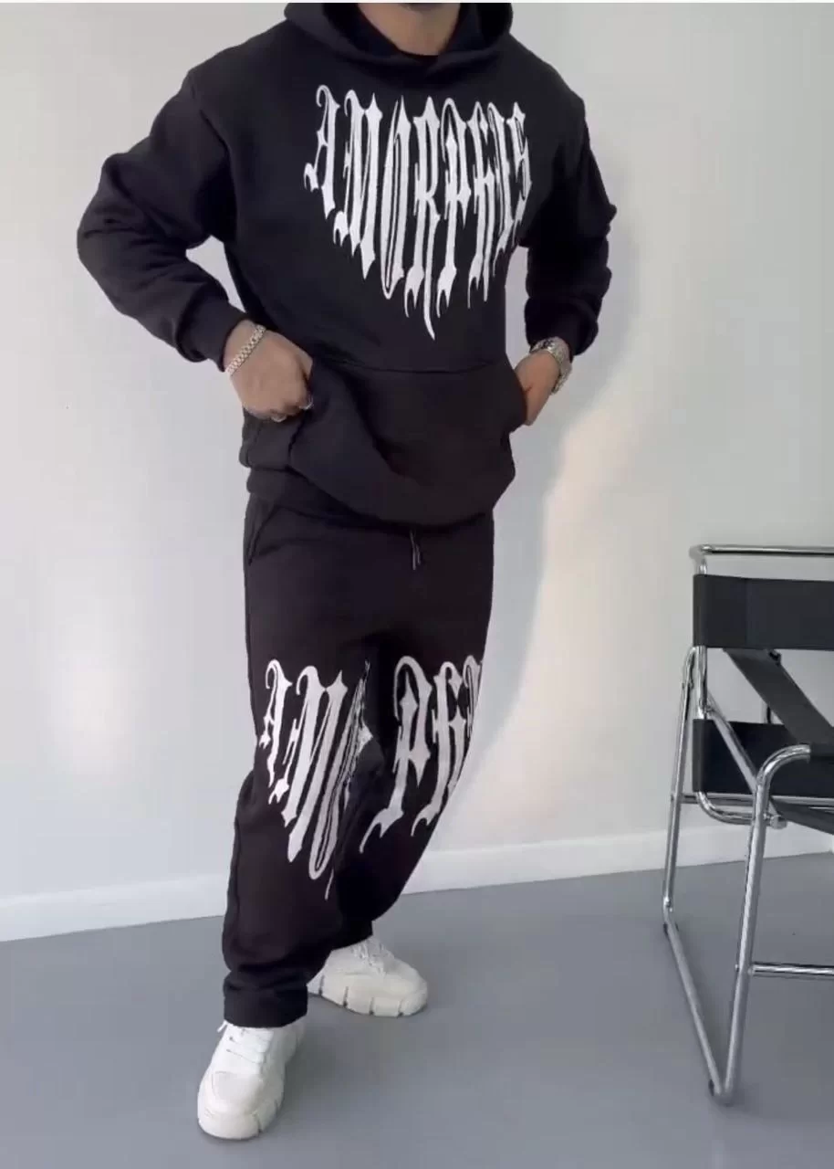 Kışlık Kapüşonlu Üç İplik Baskılı Eşofman Takım - Siyah