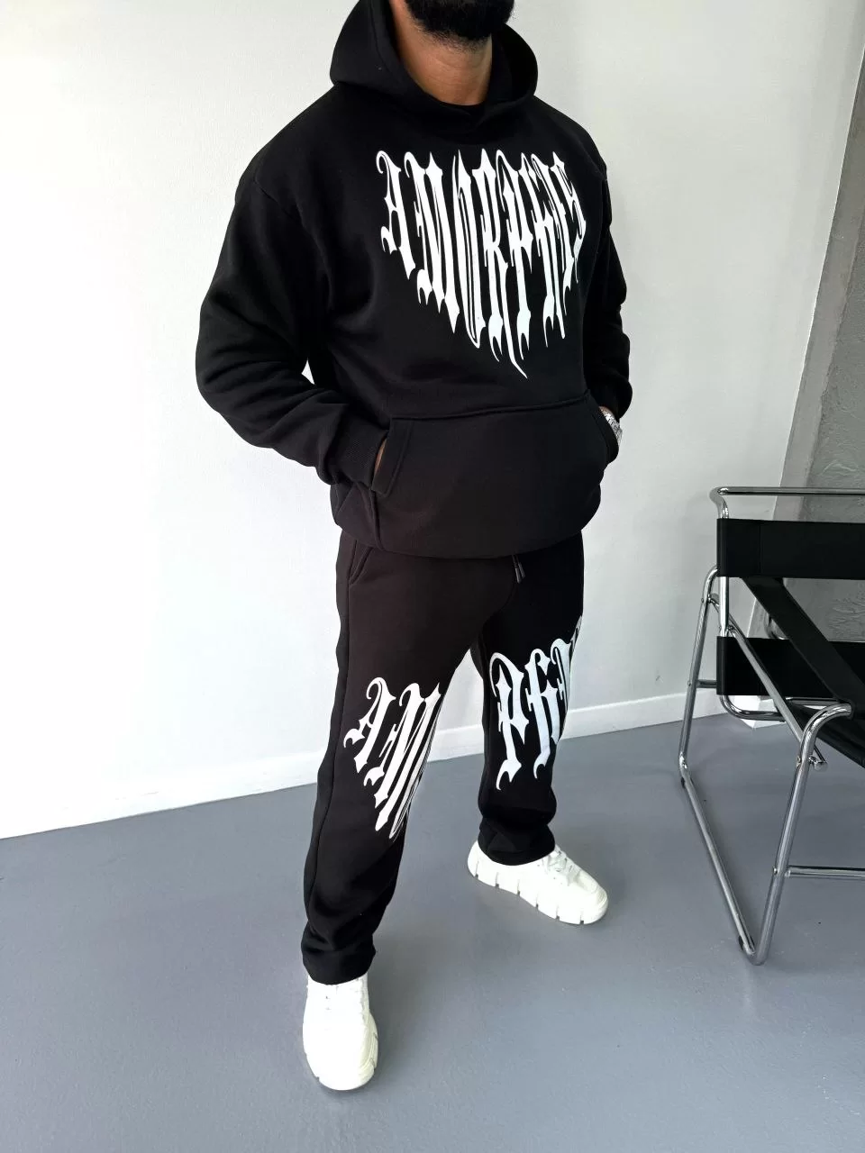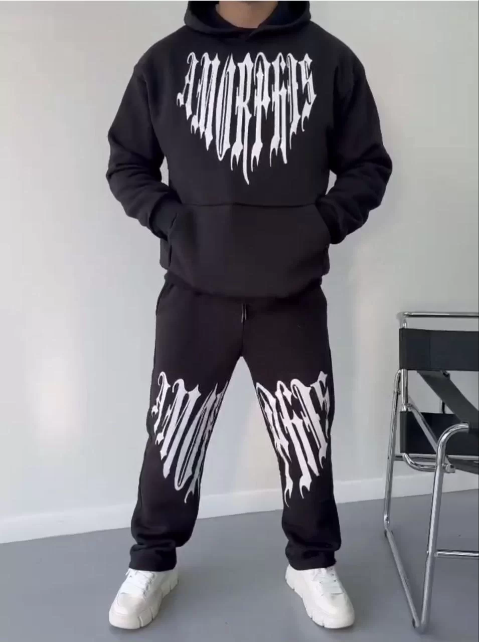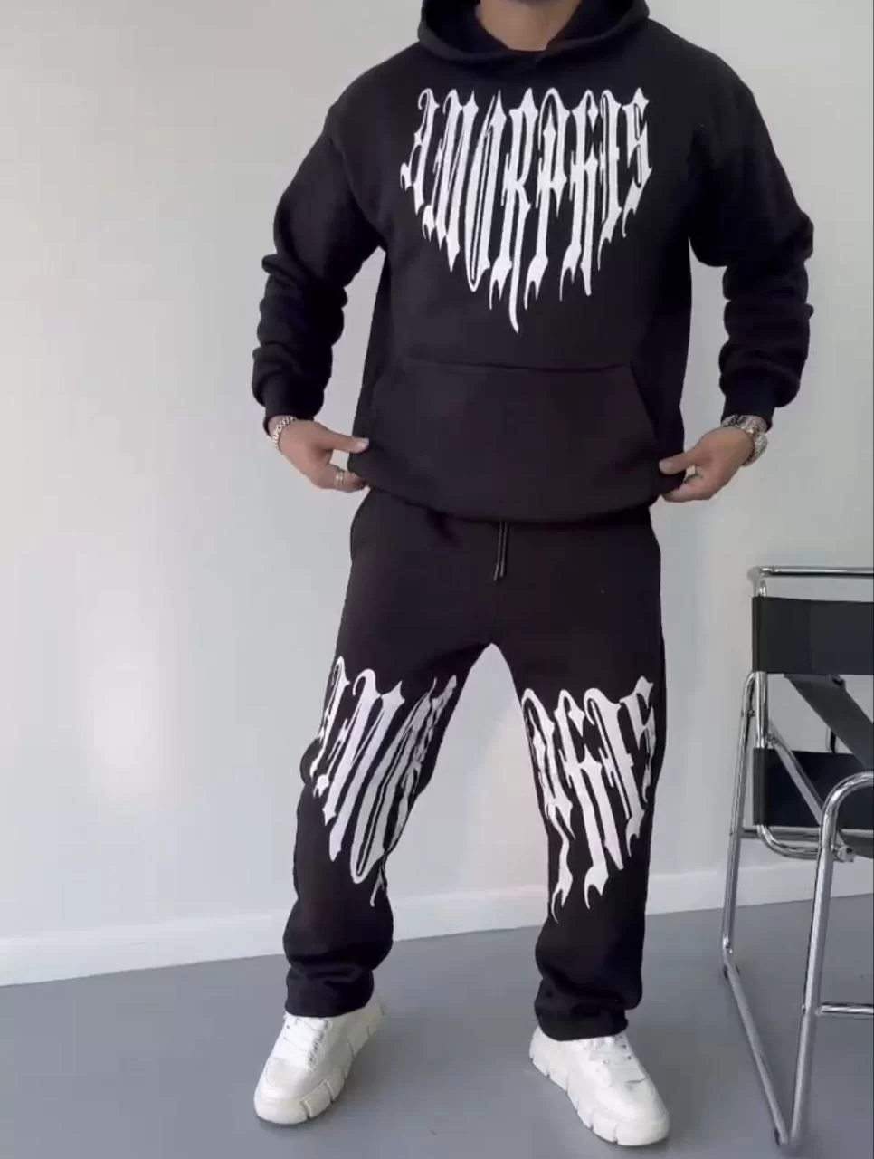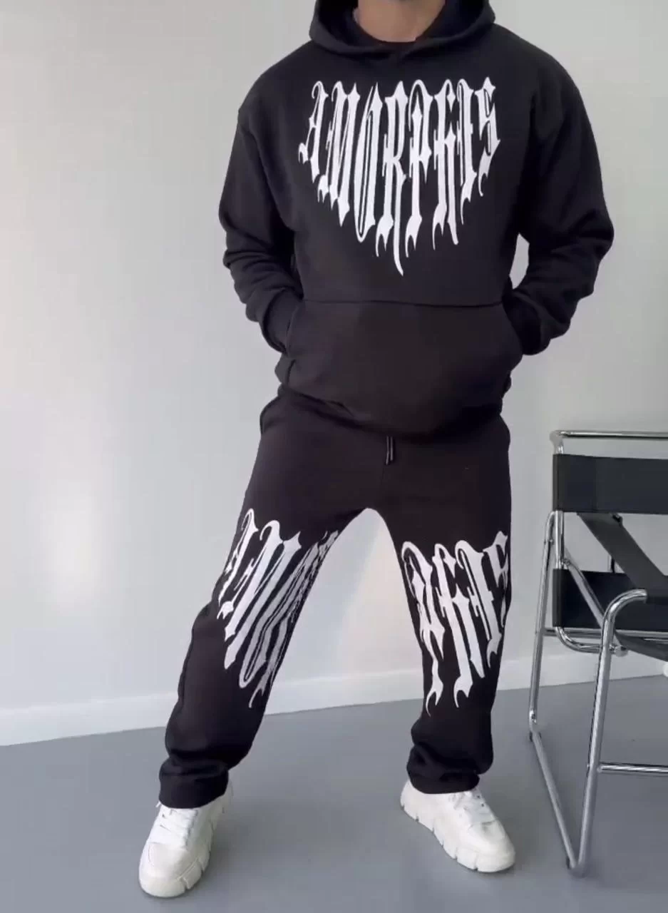 Kışlık Kapüşonlu Üç İplik Baskılı Eşofman Takım - Siyah