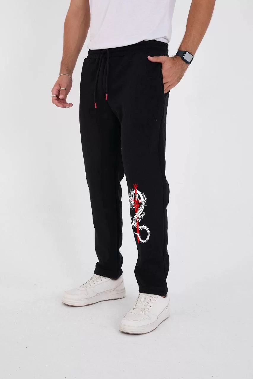 Kışlık Üç İplik Baskılı Eşofman Pantolon - Siyah