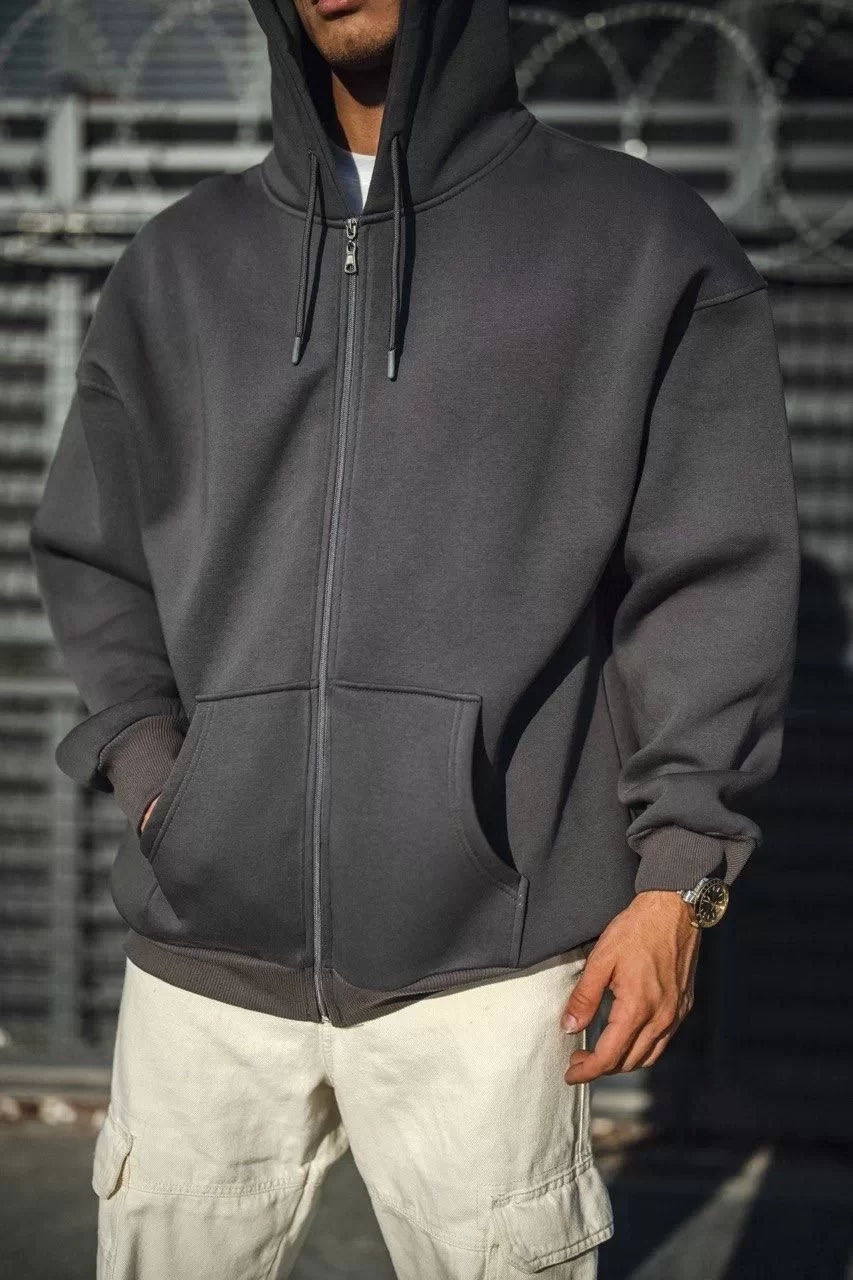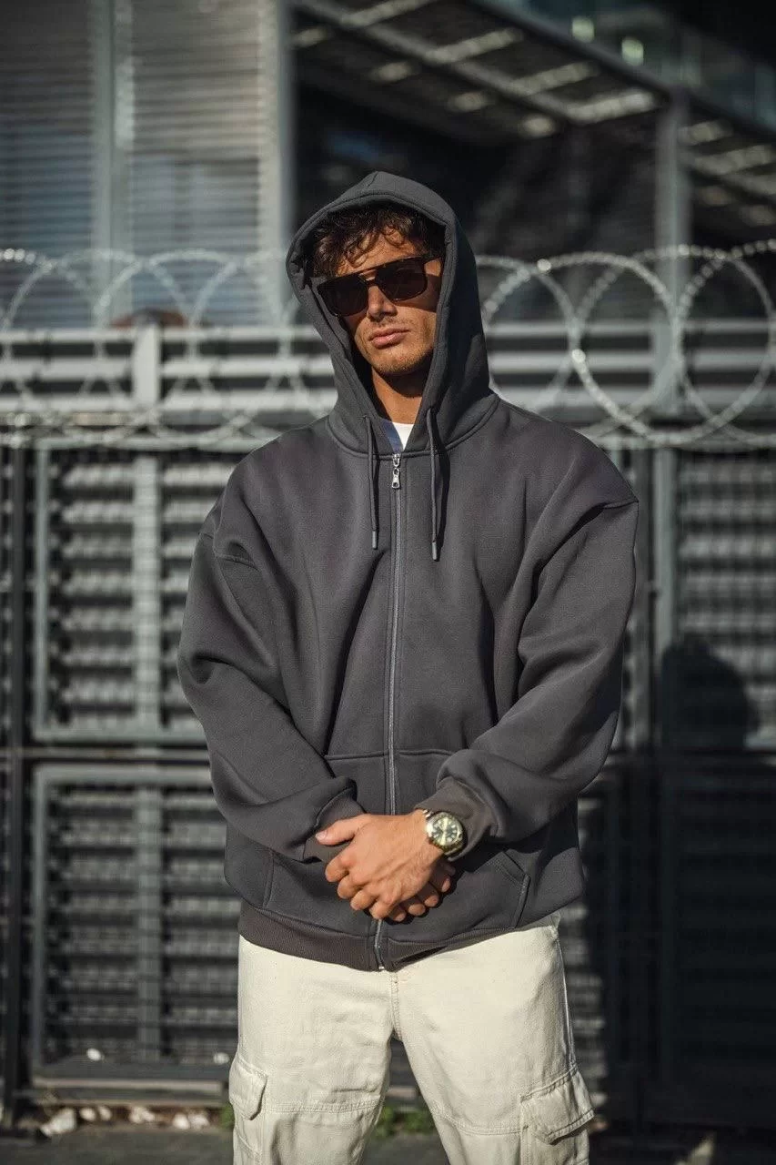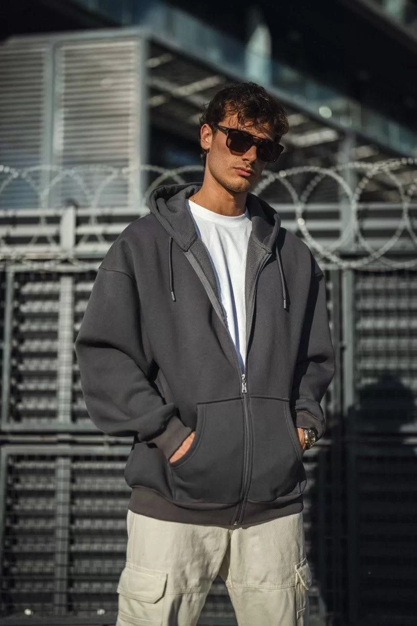 Oversize Tam Fermuarlı Uzun Kol Hırka - Füme