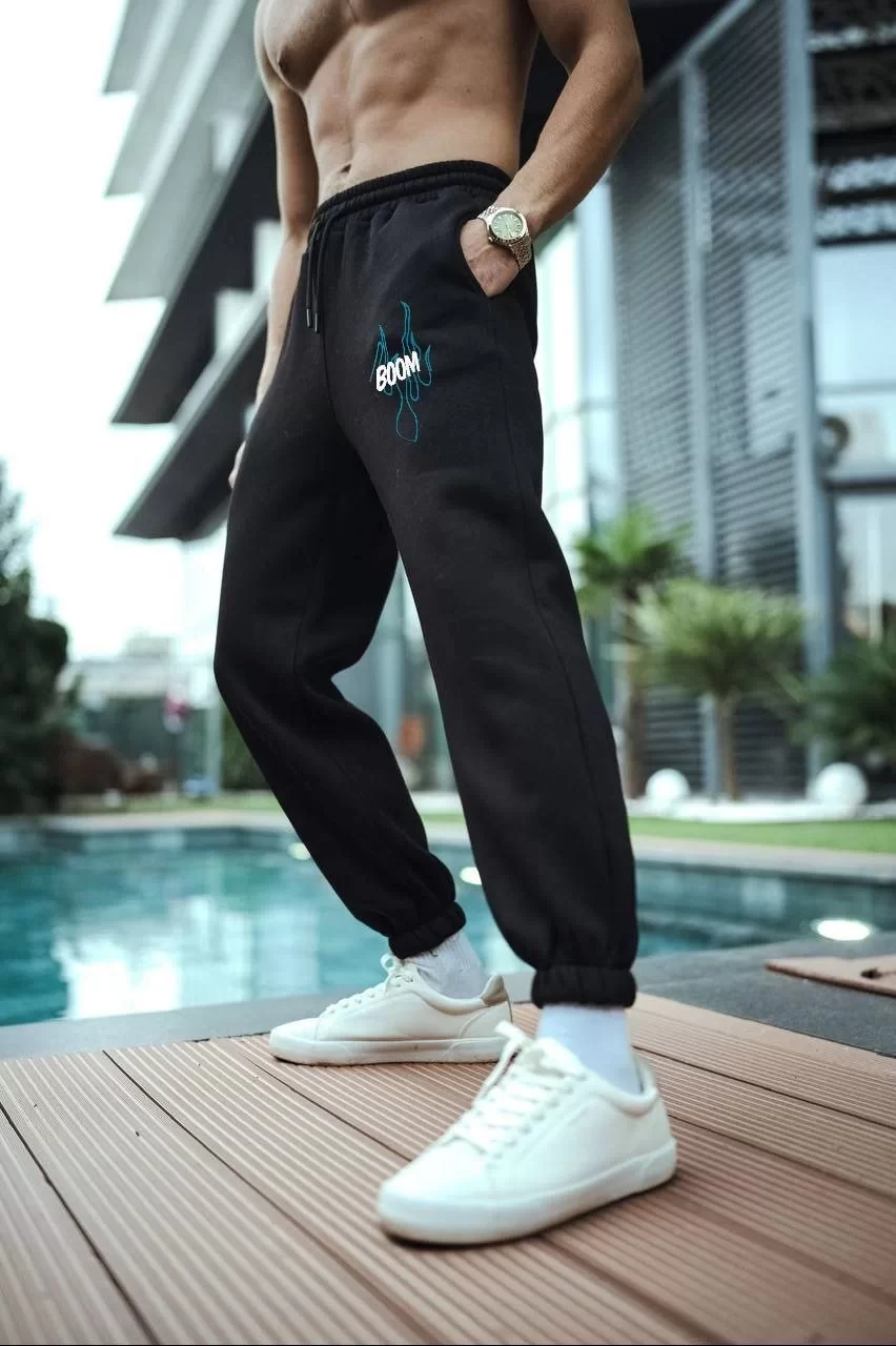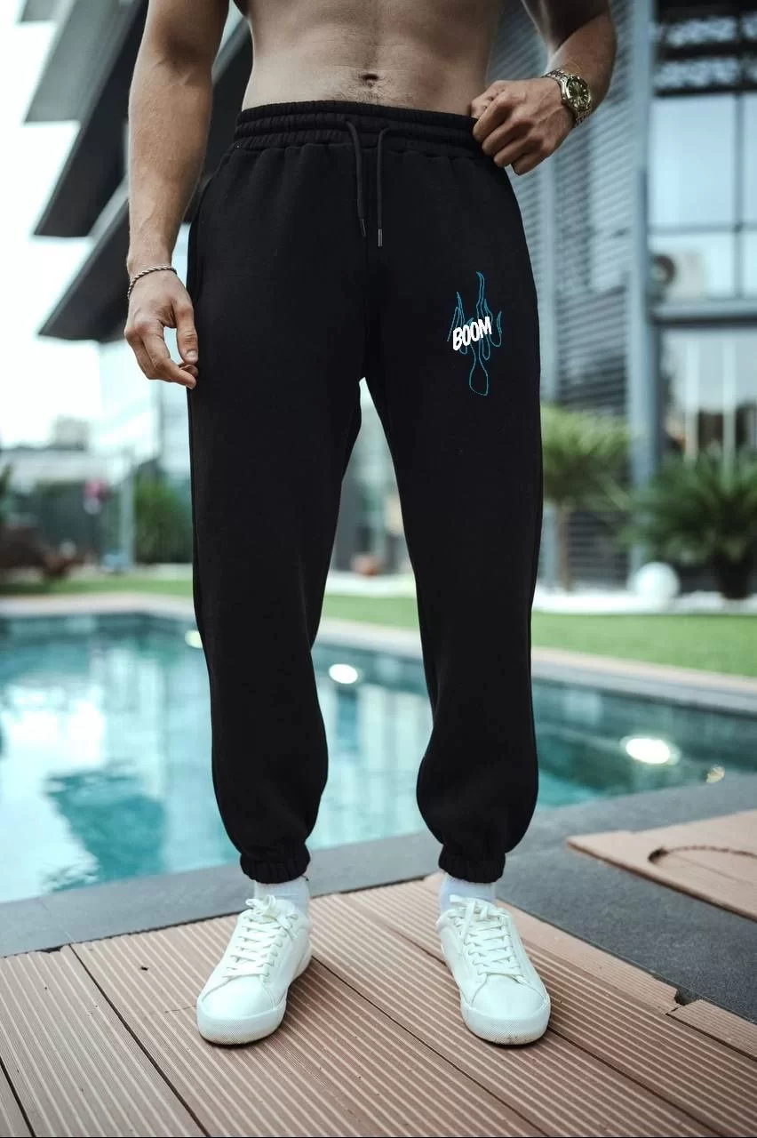 Oversize Üç İplik Baskılı Eşofman Pantolon - Siyah