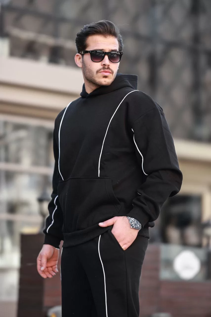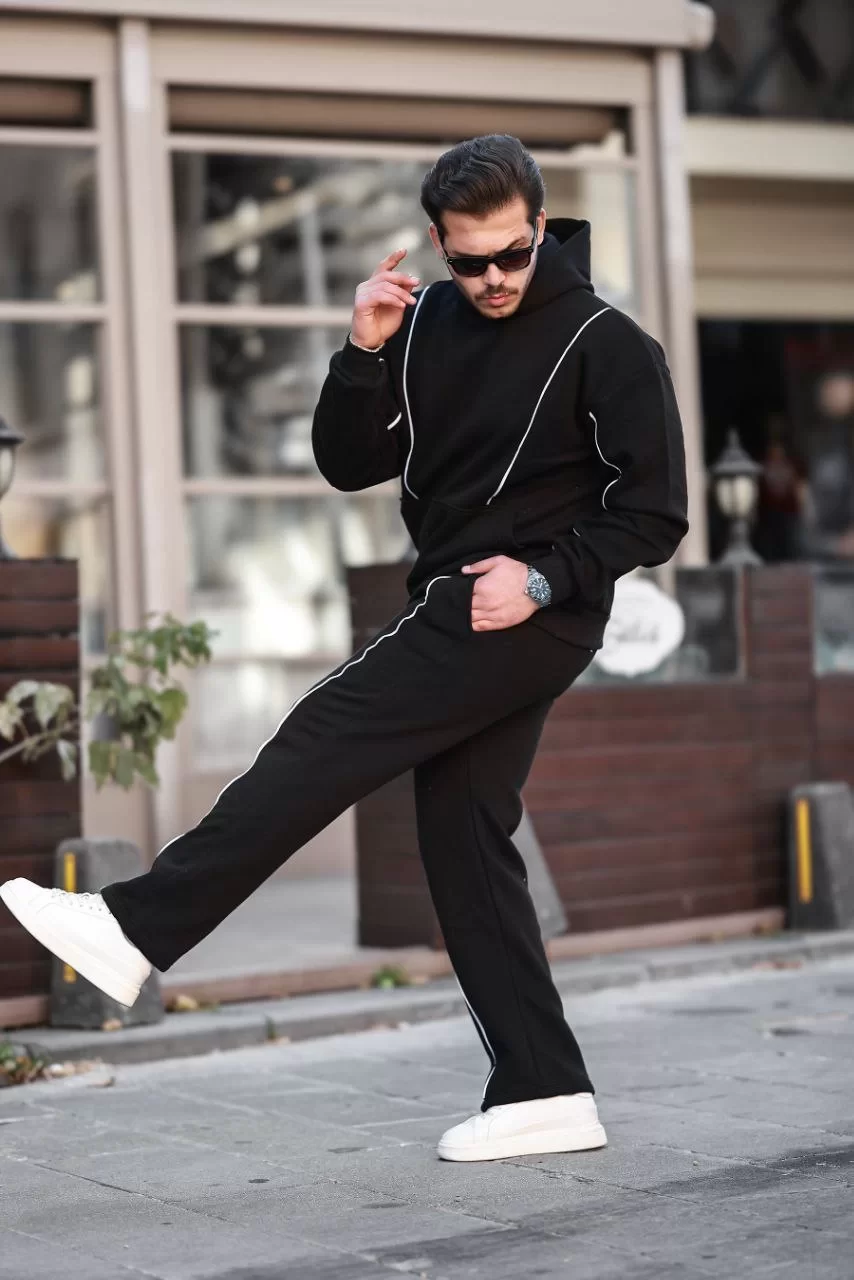 Şeritli Üç İplik Kapüşonlu Eşofman Takım - Siyah