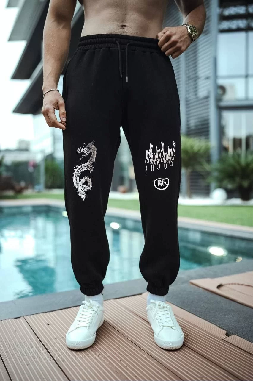 Üç İplik Baskılı Eşofman Pantolon - Siyah
