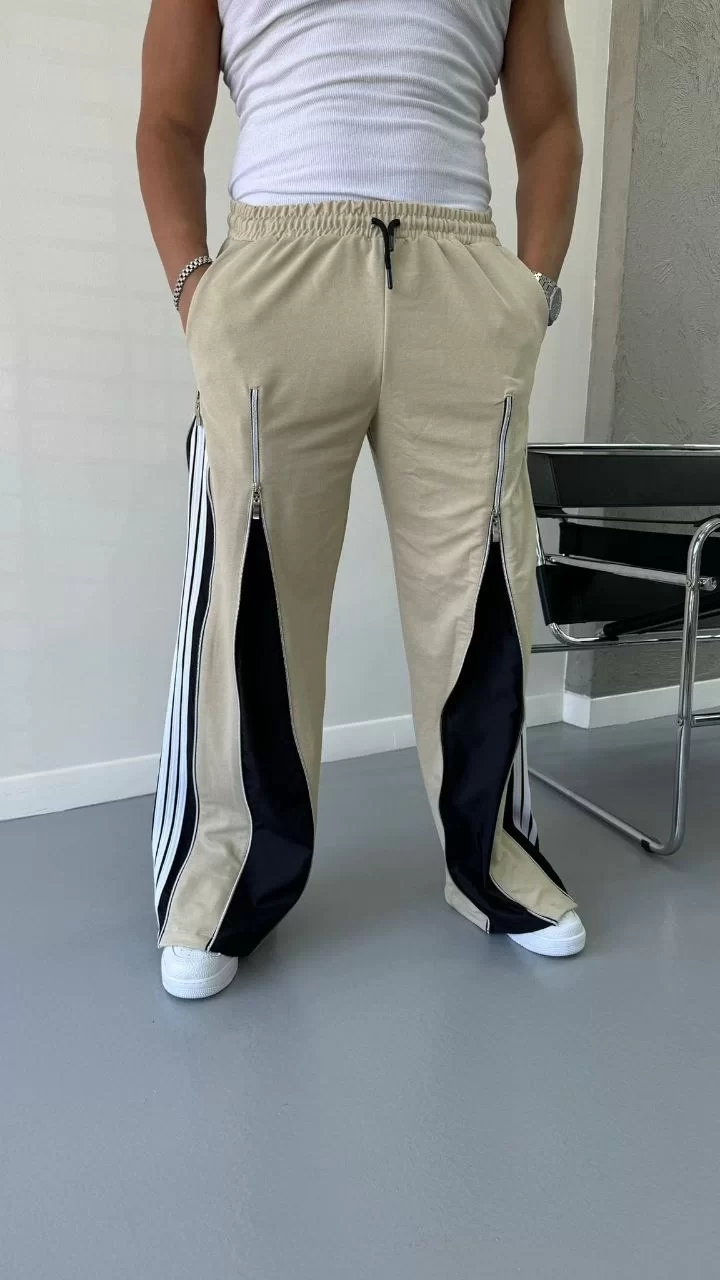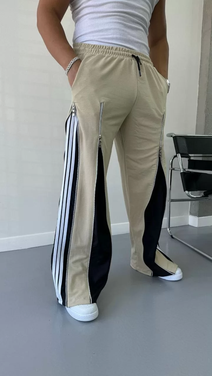 Unisex Fermuarlı Şeritli Buggy Pantolon - Bej
