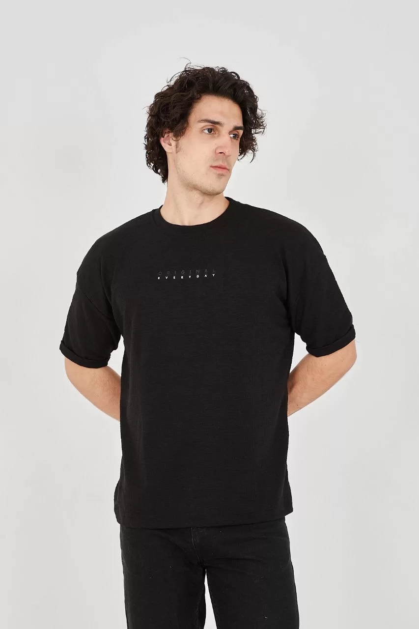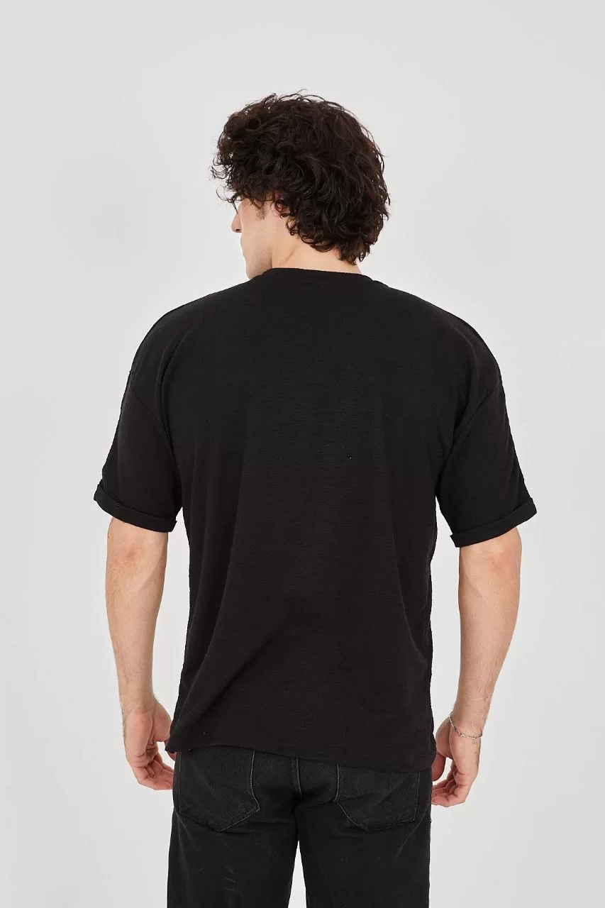 Unisex Jakar Kumaş Rahat Kol T-Shirt - Siyah